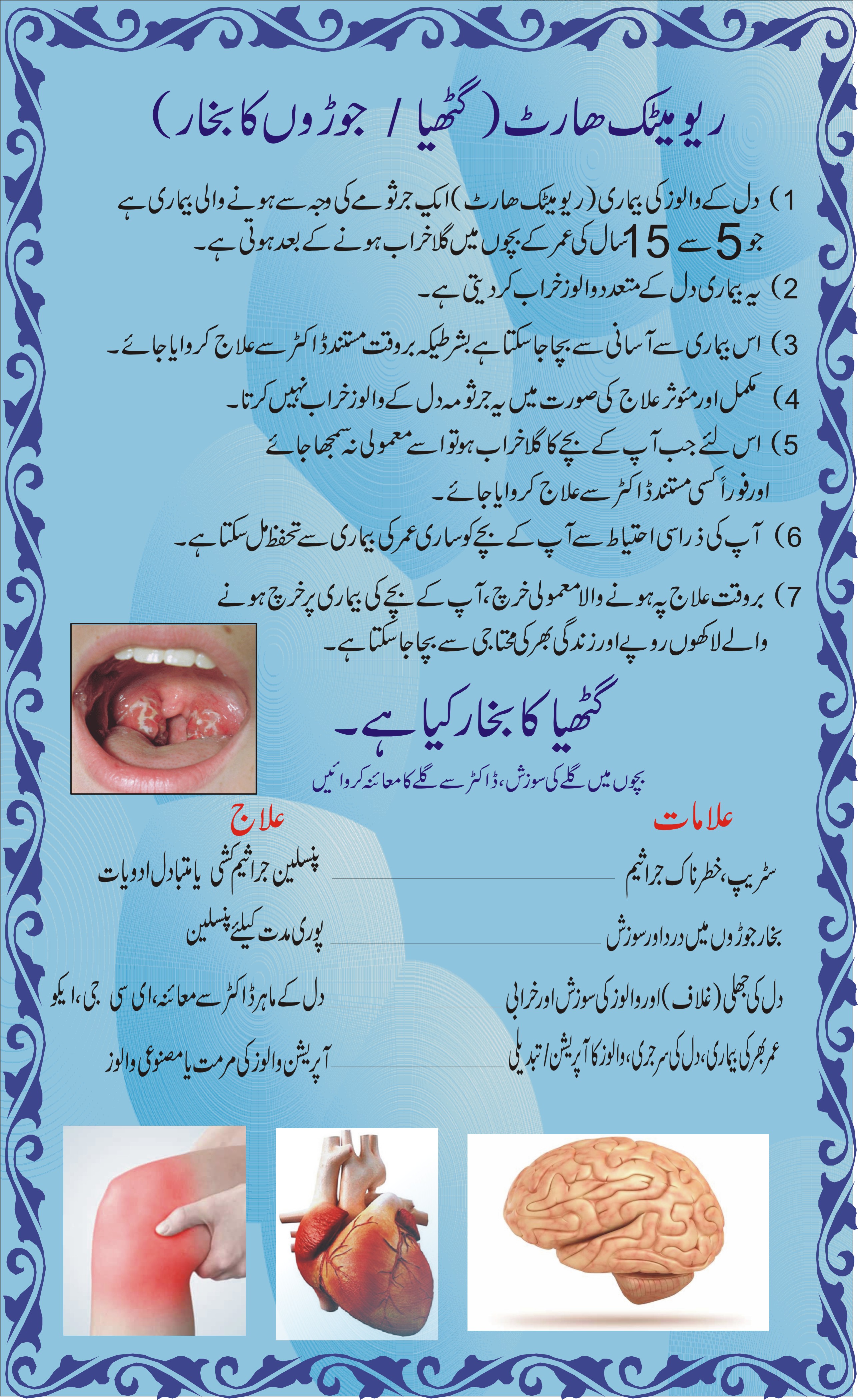 It is stated that Rheumatic fever (RF) and rheumatic heart disease (RHD) is the commonest cause of heart disease in 5-30 years of age groups and accounts for 25-40% of all cardiovascular diseases in developing countries. Rheumatic heart disease is the disease of heart valves which occurs after untreated sore throat 21.9 / 1000 children in Pakistan are suffering from this disease. Around one million sufferers of this disease may be living in our country. One hard point about this disease is that it is not curable.